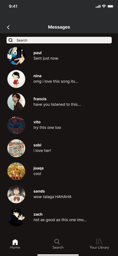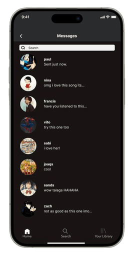 Spotify Messenger is an imagined feature for Spotify that allows users to directly message songs, artists, and playlists on the app to their friends. By providing an option to primarily share content through Spotify, this will effectively remove the need to send a message via secondary apps and further enhance the collaborative listener's experience.