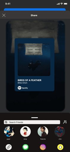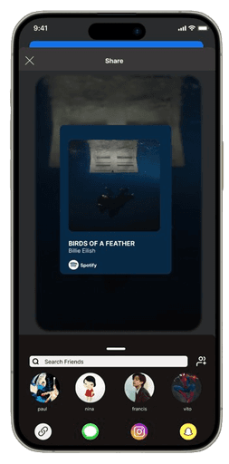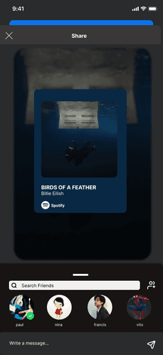 3 rounds of concept testing led to the option to share with Spotify friends seamlessly within the share button and users are able to select more than one friend at a time to send their selected content.