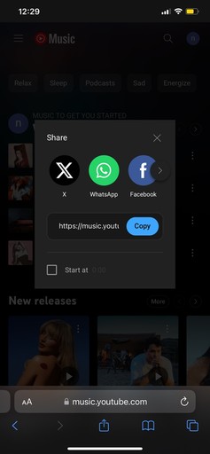 Youtube Music has the user share the content that they want via secondary apps or by copying the link.